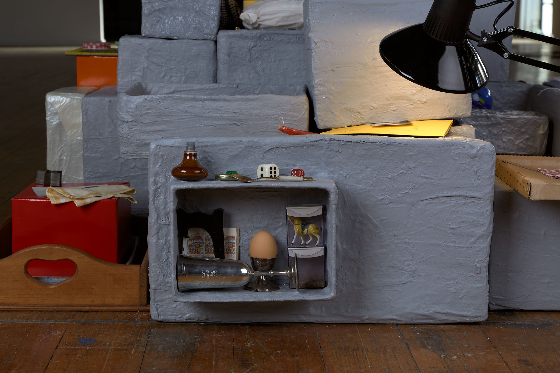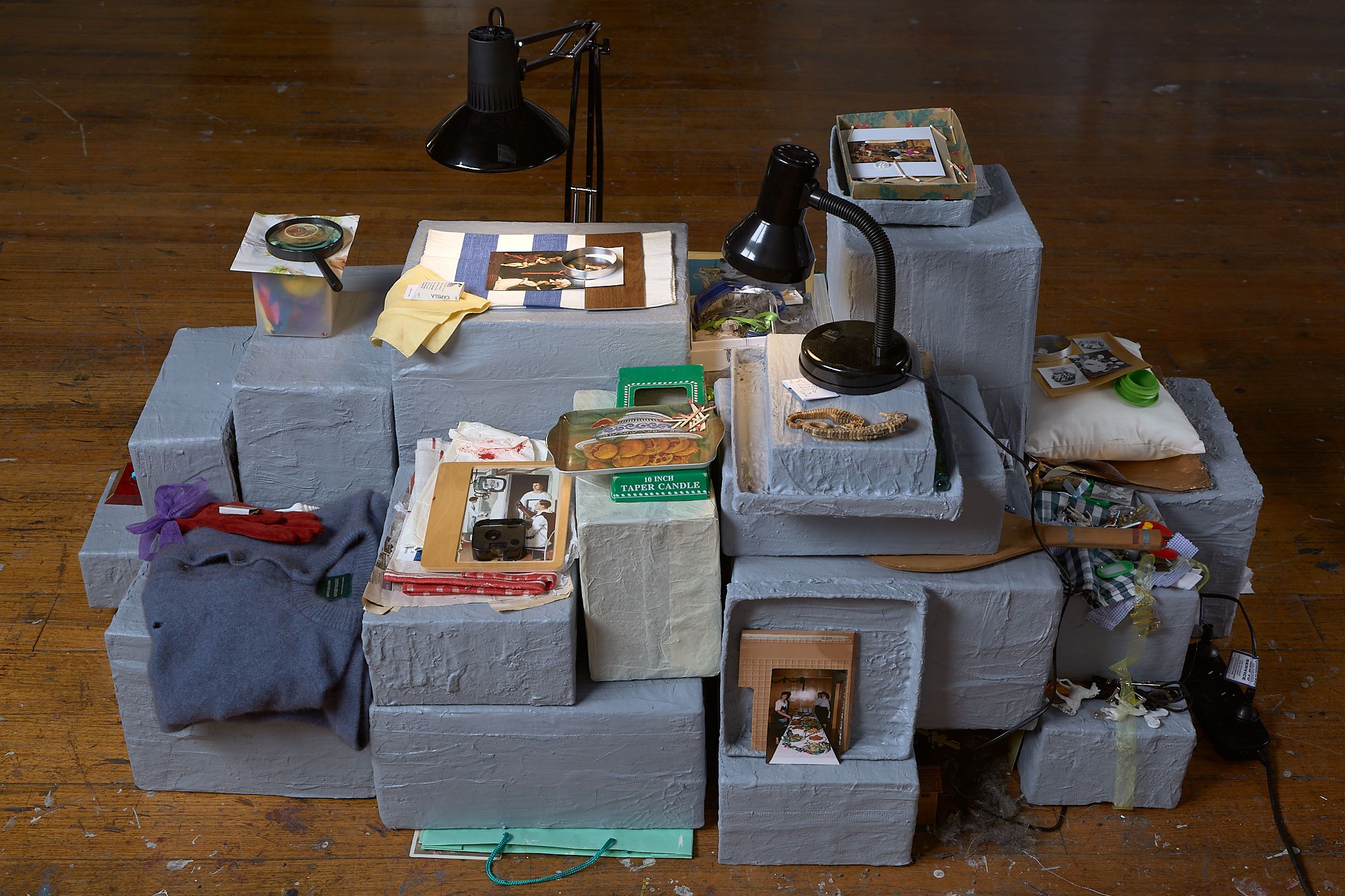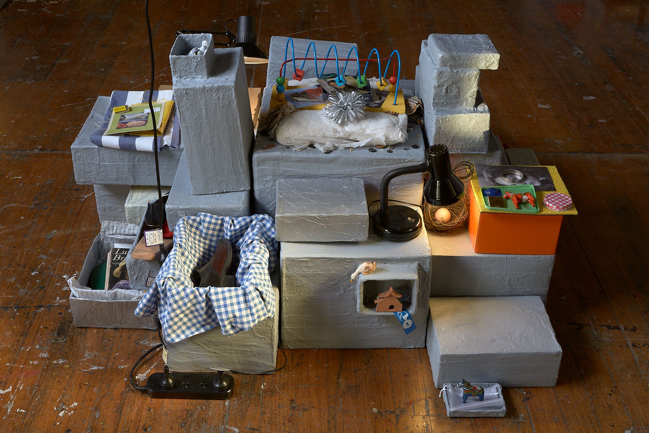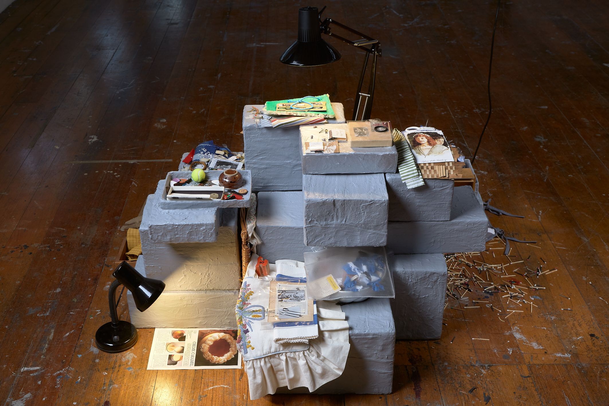 From what is kept inside a desk drawer to content discovered in the inner depths of an old coat pocket are the, often familiar, materials and personal possessions from Stonehouse's own daily life that become assemblages. The works refer to the experience of constructing a secret place, where anything can happen, built on childish wonders and the worries we form at night. The creations are a nod to an optimistic childhood, a projected safe place; a place of temporality and a place to hide in. It is like that sandwich you get from your Mum: evenly cut in half, filled with peanut butter, its filling cocooned by the soft white bread, hidden inside. This exact sandwich sits inside a container, inside a bag, on its way somewhere, being lugged around.