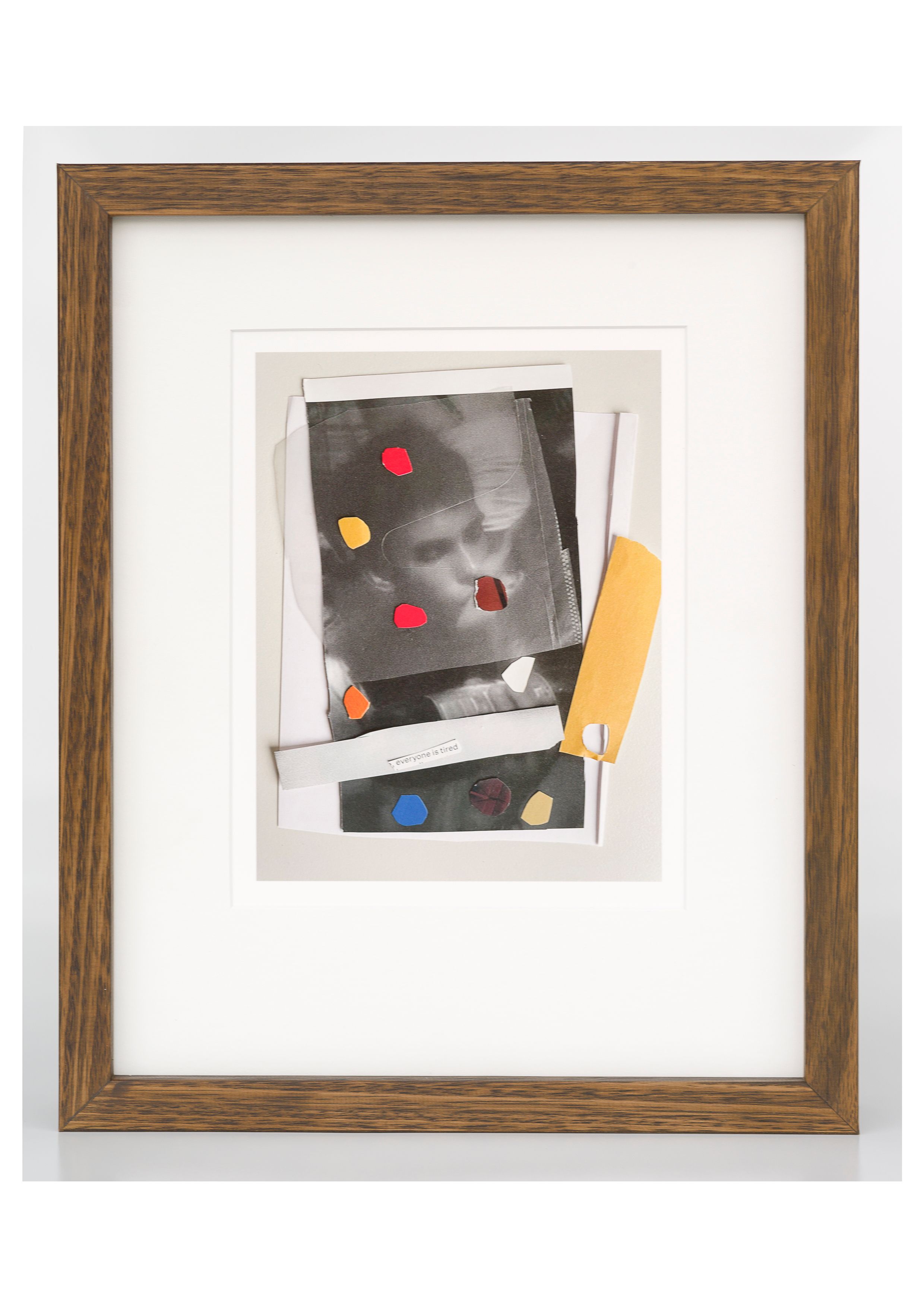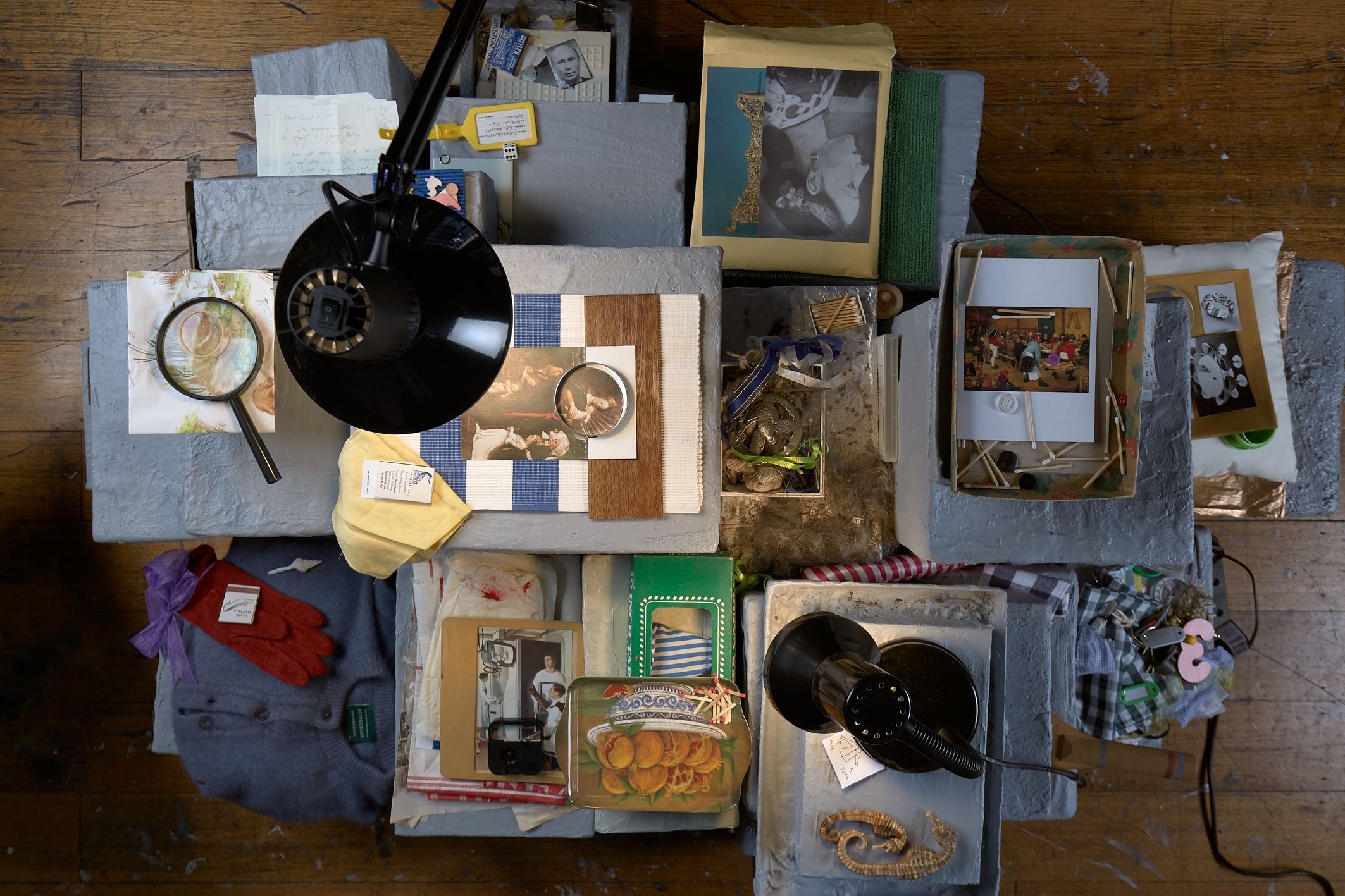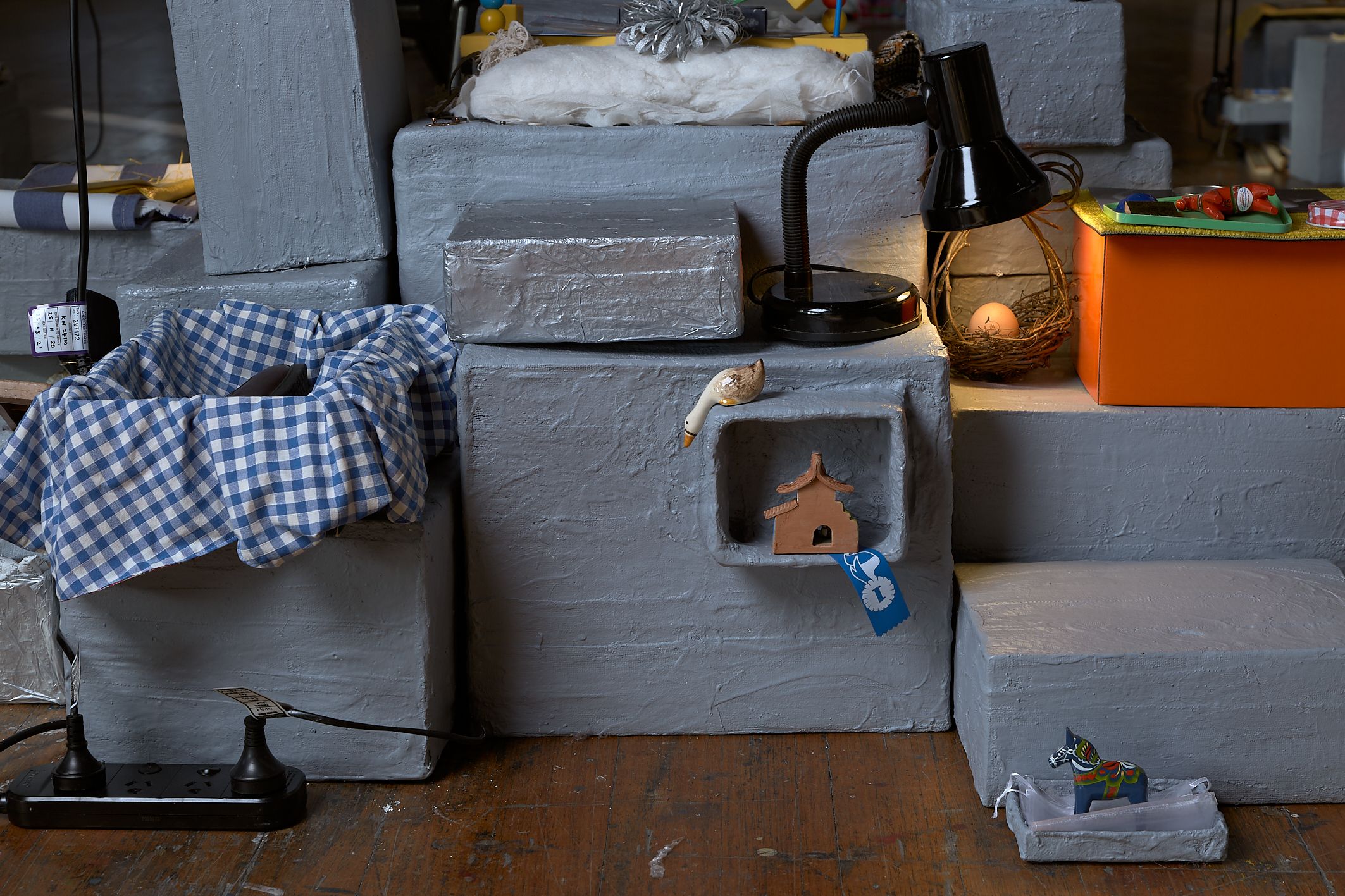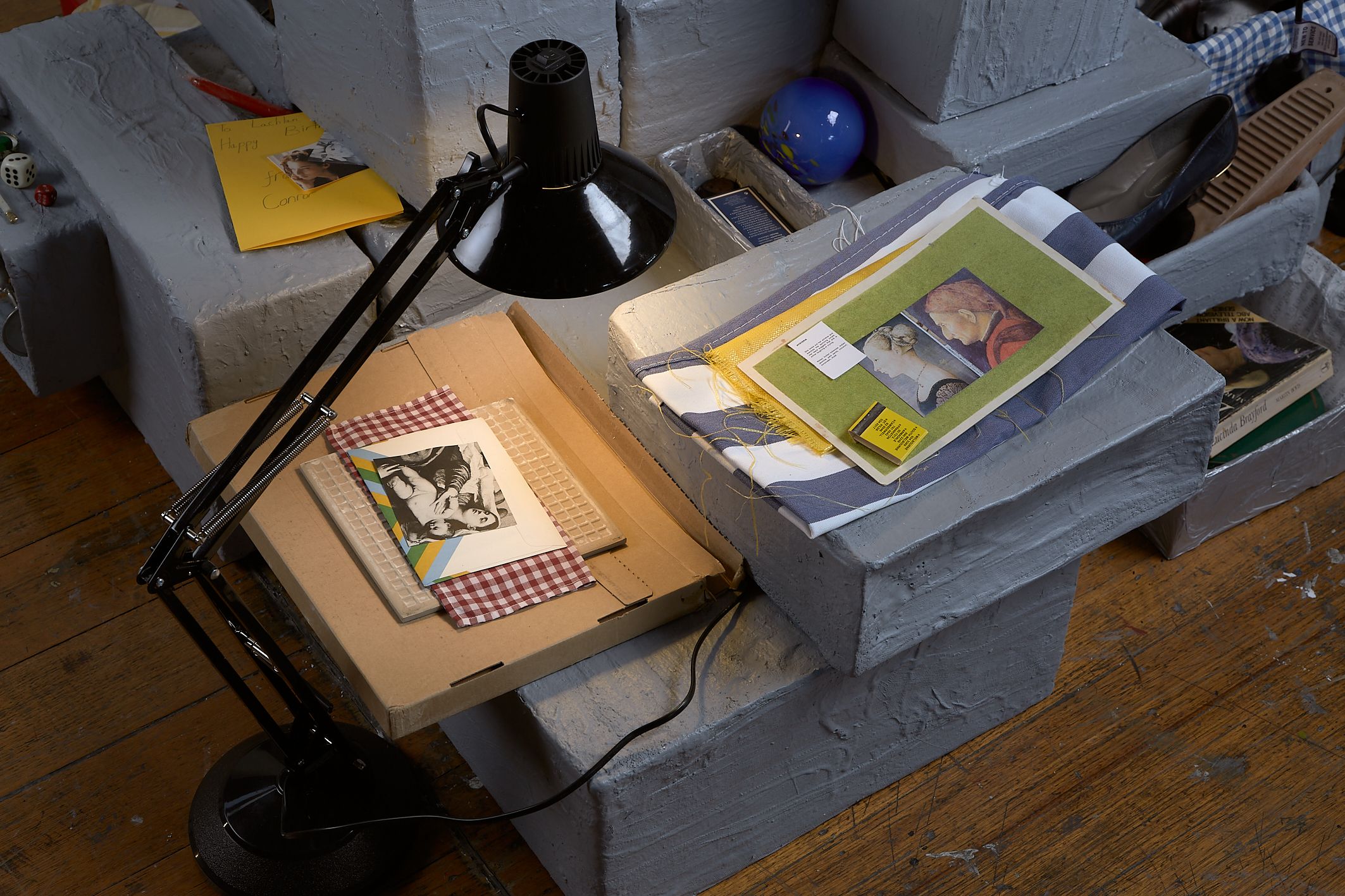 From what is kept inside a desk drawer to content discovered in the inner depths of an old coat pocket are the, often familiar, materials and personal possessions from Stonehouse's own daily life that become assemblages. The works refer to the experience of constructing a secret place, where anything can happen, built on childish wonders and the worries we form at night. The creations are a nod to an optimistic childhood, a projected safe place; a place of temporality and a place to hide in. It is like that sandwich you get from your Mum: evenly cut in half, filled with peanut butter, its filling cocooned by the soft white bread, hidden inside. This exact sandwich sits inside a container, inside a bag, on its way somewhere, being lugged around.